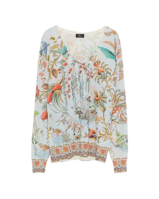 Blue floral print round neck long sleeves patterned hem Size: 42. Gender: Female. Material:Silk/Cashmere. Colour: white