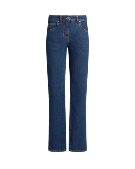Regular-fit five-pocket jeans. The item, presented at the Spring-Summer 25 Women's Runway Show, is made from slightly stretchy cotton denim and enhanced by an embroidered Etro logo on one of the two rear pockets. The metal button with raised Pegaso logo and label with Pegaso symbol and ETRO logo complete the garment. Regular fit Regular waist Five pockets Belt loops Pegaso button and zip closure Made in Italy The model is 5' 9½" (177 cm) tall and wears a size 26 Colour: blue