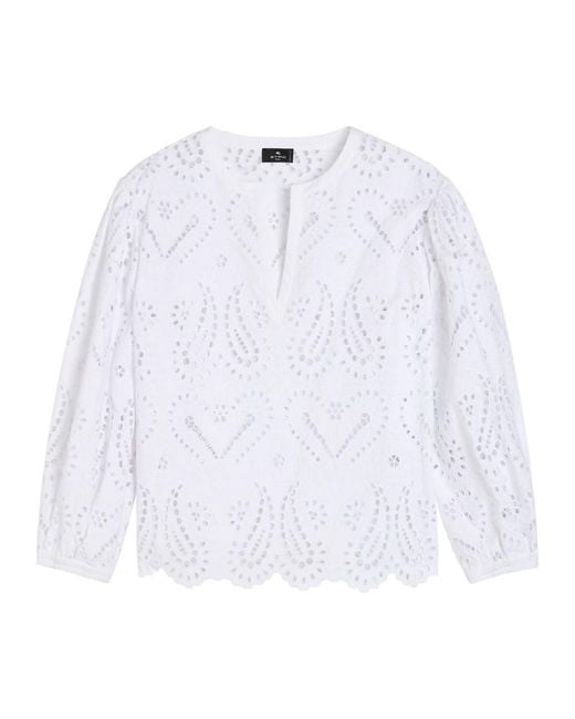 Info & Care Etro cotton-blend blouse Open embroidery, cut out at round-neck, elasticated cuffs, scalloped hem Slips on 56% cotton, 44% polyester Machine wash Size & Fit Length shoulder to hem: 21 inches/ 53.5cm Midweight Relaxed boxy fit Model is 5'9""/ 175cm and wears a size small Colour: white