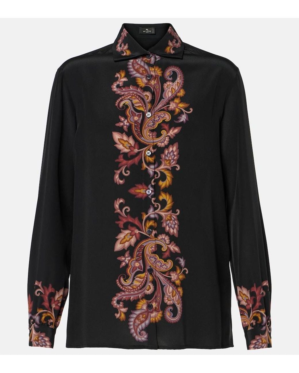 Material: 100% silk. Care instructions: dry clean. Made in Italy. Designer colour name: Print On Black Base. Closure: button-down. Buttoned cuffs. Silk. Colour: black