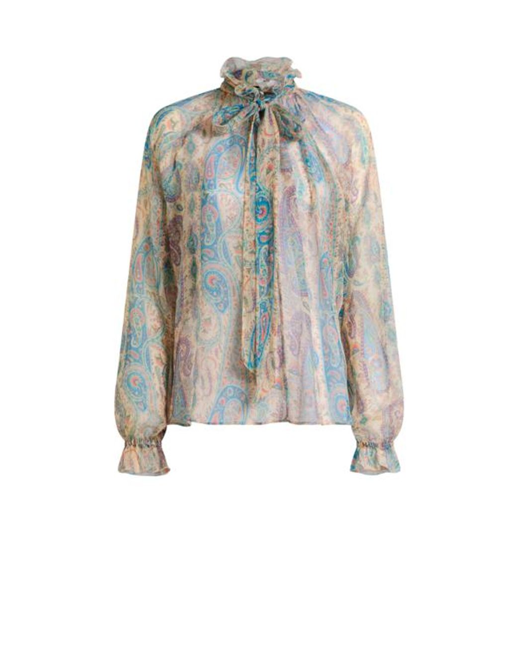 Blouse in lightweight pure silk crepon embellished with iconic Paisley motif enhanced by foliage-inspired elements. Featuring long balloon sleeves, this piece is finished with a delicate silk scarf and tonal ruffles at the collar and cuffs. Regular fit Turtleneck with silk scarf Long puff sleeves Made in Italy The model is 5' 9½" (176 cm) tall and wears a size 40 Colour: blue