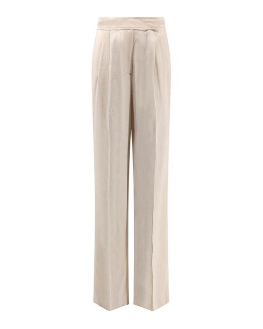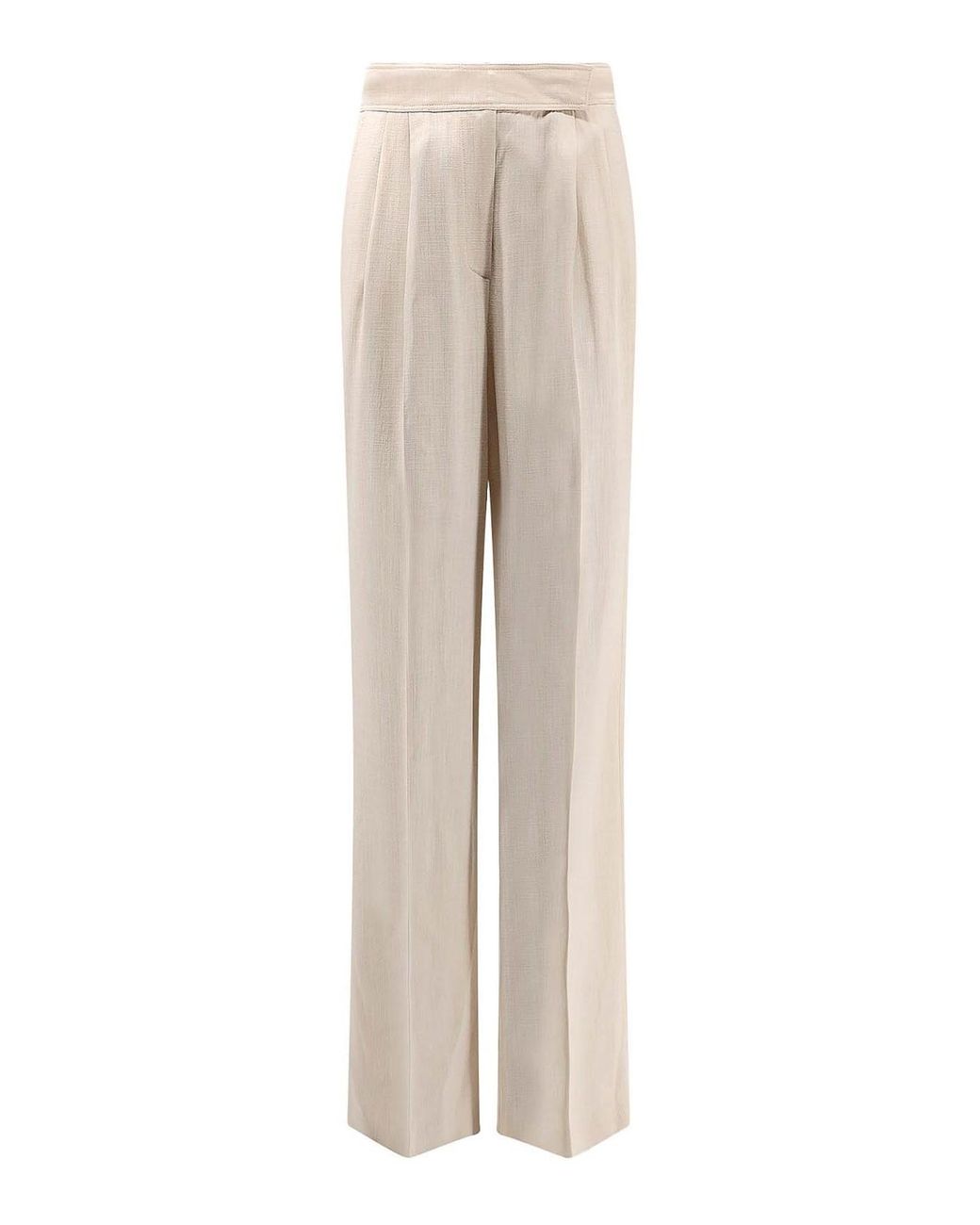 Zip and double hook closure, double pleat detail, slant pockets on the front, back pocket with button, wide leg. Colour: natural
