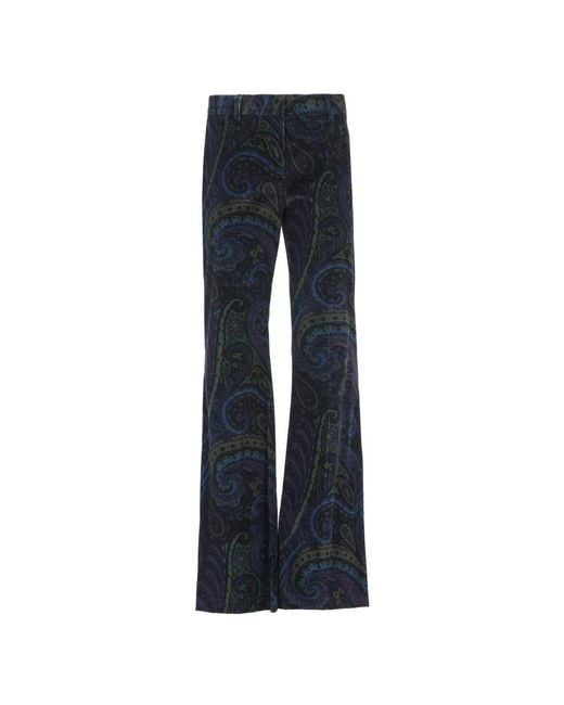 Elevate your style with these Etro velvet trousers featuring a flared line and ironed pleat at the bottom. The stretch cotton-blend jersey material is adorned with an all-over Paisley jacquard pattern, concealed hook and zip fastening, and back welt pockets. Slim fit for a chic look.