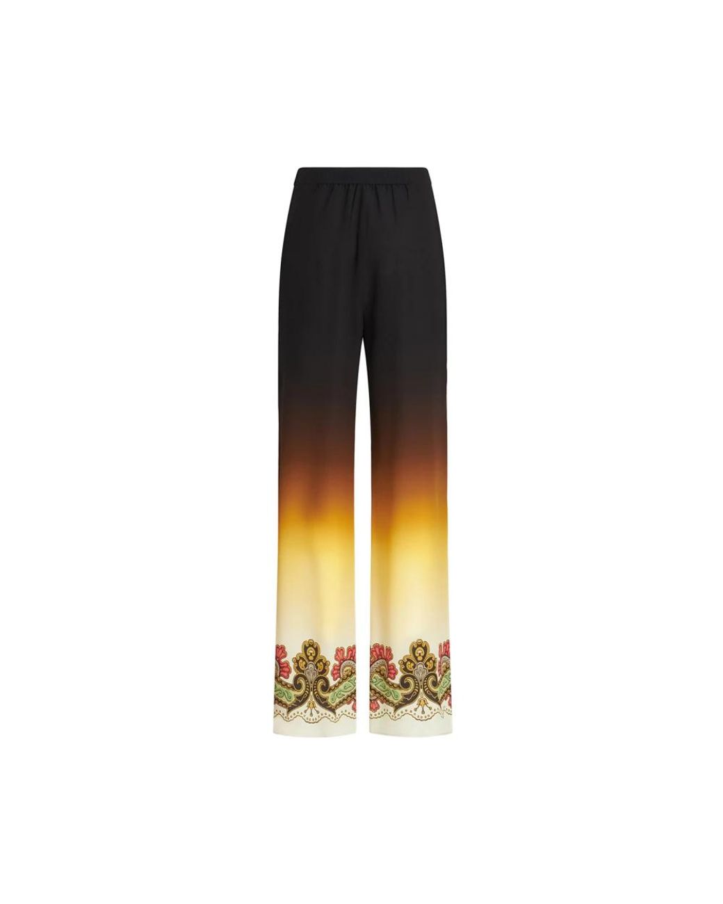 Elevate your wardrobe with these stunning Etro Palazzo Trousers, crafted from luxurious orange silk crepe de chine. Featuring a beautiful degradé shading and ornamental floral border motifs, these trousers are perfect for any occasion. Key attributes: Orange | Silk Crepe de Chine | Elasticated waistband | Two side pockets | Degradé shading | Ornamental floral border motifs | Ironed pleat | Dimensions & fit: Regular fit | Composition & care: 100% Silk | Dry clean only Colour: orange