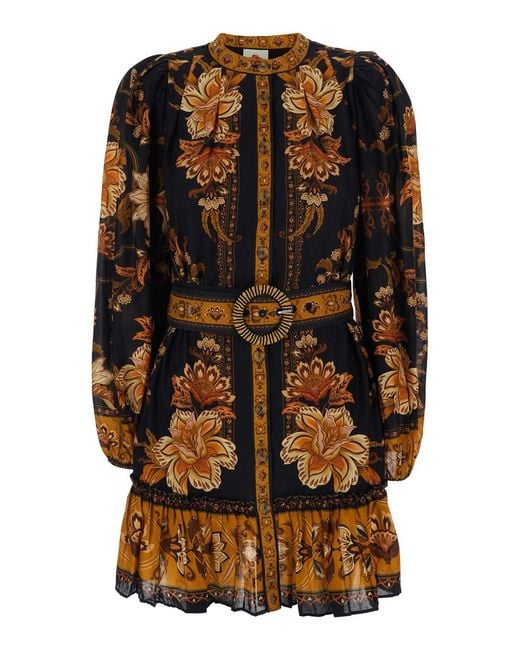 - 'Majestic Garden' Crewneck Mini Dress With All-Over Floral Motif And Front Belt