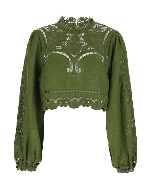 Women's Green 'Majestic Garden' Cropped Crewneck Blouse With Floral Cut-Out And All-Over Embroidery
