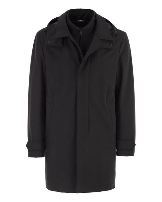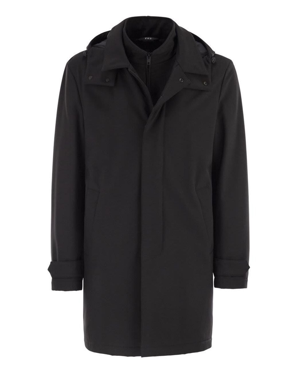 Morning coat travel jacket in stretch jersey with water-repellent treatment and removable hood. The model, padded with stretch wadding, features toggles at the bottom of the sleeves, welt pockets and a zip fastening with concealed press studs. A practical internal pocket and the fay travel label complete the garment. - removable hood - bib with zip fastening - concealed snap button fastening - regular fit designer id: nam6151037jxrfb999SpecificationValueSeasonFW25Composition88% POLYAMIDE 12% SPANDEX LINING: 98% POLYESTER, 2% SPANDEX FILLING: 100% POLYESTERColorBLACKColor CodeB999Made InITALYISOITDepartmentMenSectionCLOTHINGSubsectionOUTERWEARSize InformationSTANDARDSize CodeSML Colour: black