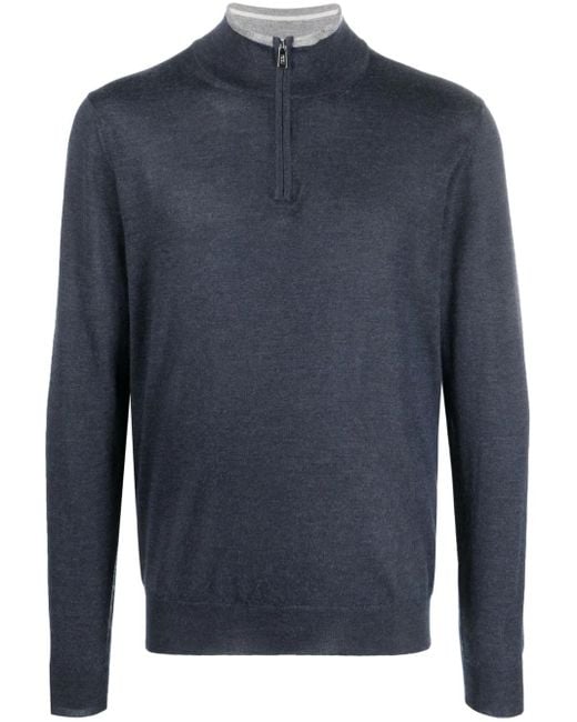 Blue cashmere-silk blend knitted construction mock neck short front zip fastening long sleeves ribbed cuffs and hem straight hem Size: 54. Gender: Male. Material:Cashmere/Silk. Colour: blue