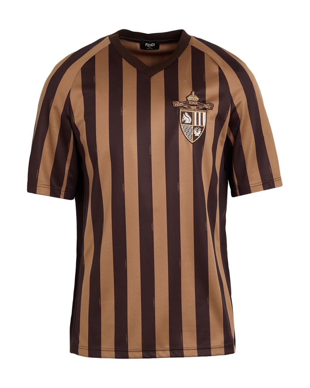 FENDI. t-shirt, jersey, striped, embellished, brand logo, v-neck, short sleeves, machine wash or dry clean, do not bleach, do not tumble dry. 100% Polyester.