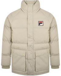 Go to MainlineFila Vintage Aspen Archive Puffa Jacket In Fila Navy. Water Resistant. A padded design with a stand up collar and a full front zip fastening concealed by a press stud placket. Ribbed cuffs
