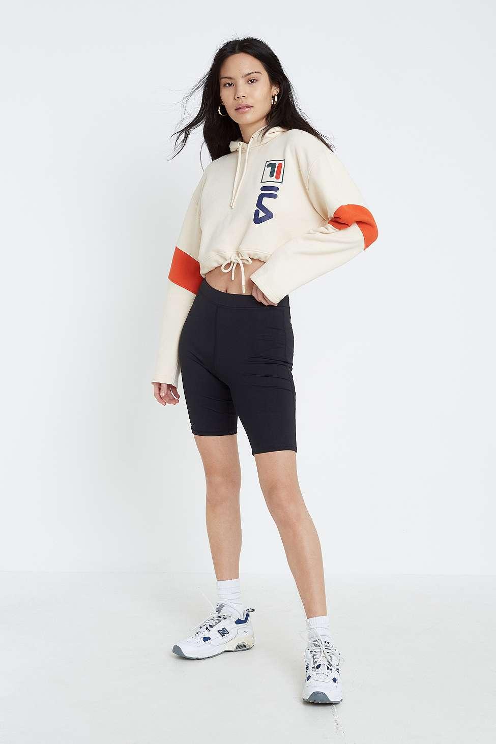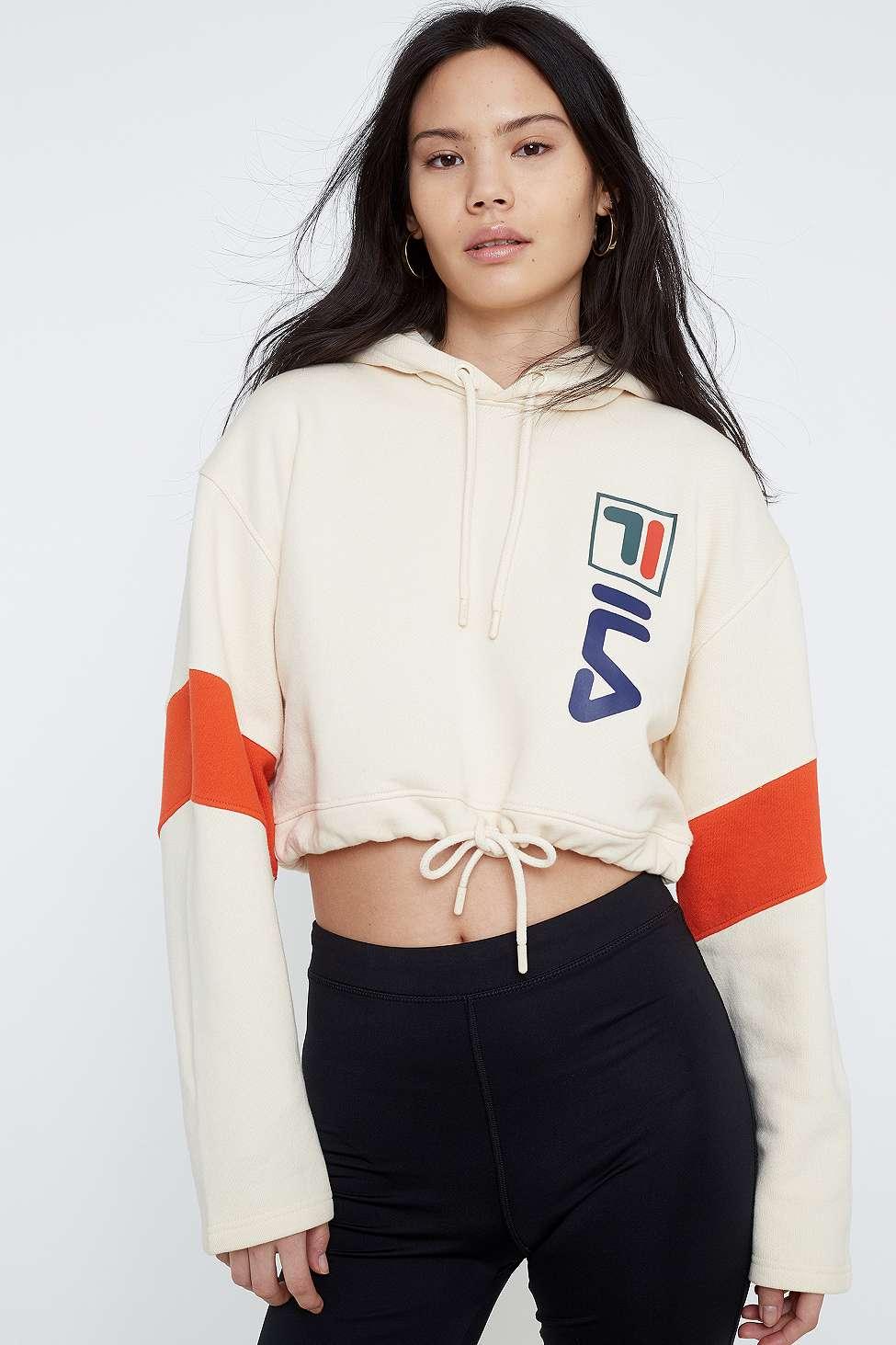 Go to Urban OutfittersPullover hoodie from athletic label FILA with colourful panels at the sleeves. Topped with a logo accent to the front. Features an adjustable hood. Finished with a cropped hem with a drawcord accent. Cotton. Colour: white
