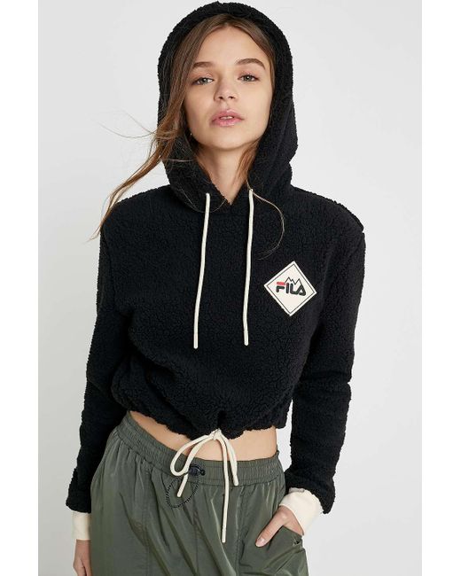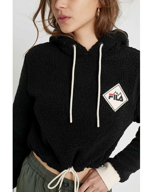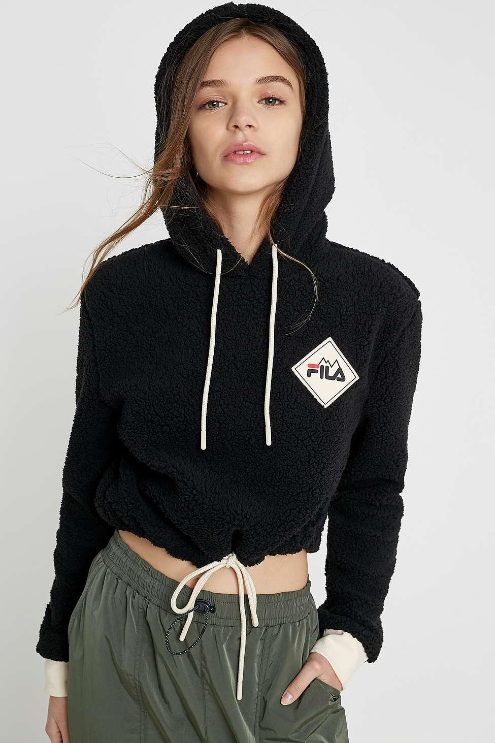 Layer up in this pullover hoodie from athletic label FILA with a plush sherpa construction. Topped with a logo patch accent to the left chest. Includes an adjustable hood and finished with a cropped hem with drawcord. Find it only at Urban Outfitters. 100% Polyester Machine wash Size + Fit. Model is 175cm/5'9" and wearing size Small. Colour: black