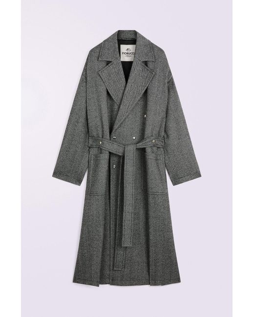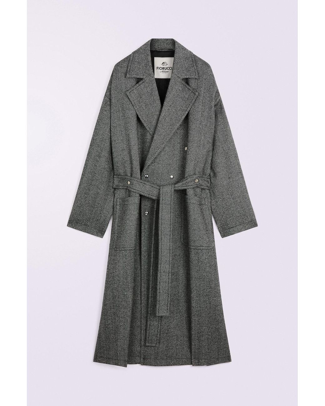 Herringbone Maxi Coat in grey, crafted from a structured wool blend. The long overcoat is crafted from a structured wool blend and features a classic notched lapel collar, front button closure, two large front pockets, and a self-tie belt to cinch the waist. Made in Italy. Colour: multicolour