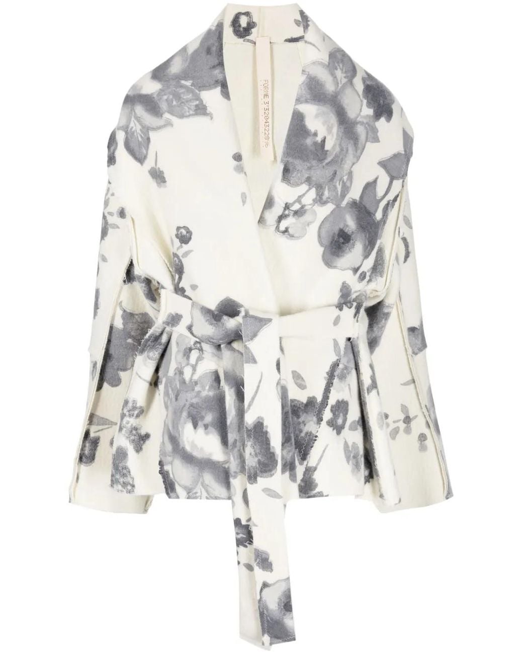 Grey/white wool-cotton blend cotton lining all-over floral print shawl lapels belted waist long sleeves straight hem Size: M. Gender: Female. Material:Cotton/Wool/Polyamide/Cotton. Colour: white