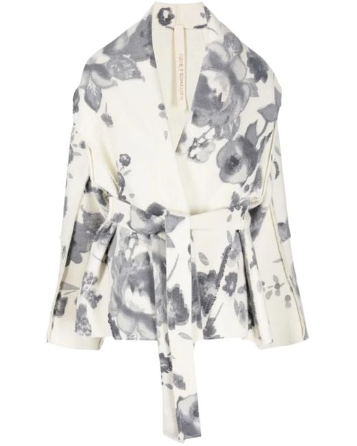 Women's White Floral-Print Belted Short Coat