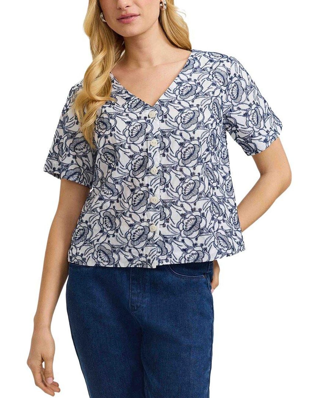 Color/pattern: white/navy Approximately 22in from shoulder to hem Measurements taken from a size small and may vary slightly by size. Button Front 100% cotton Machine wash Imported