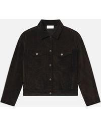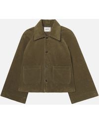 Go to FRAMEA unique take on the staple zip-up jacket, this cropped, oversized layer features blouson sleeves, a pointed collar, and large curved chest pockets for an inverse heart effect. Crafted from corduroy in an