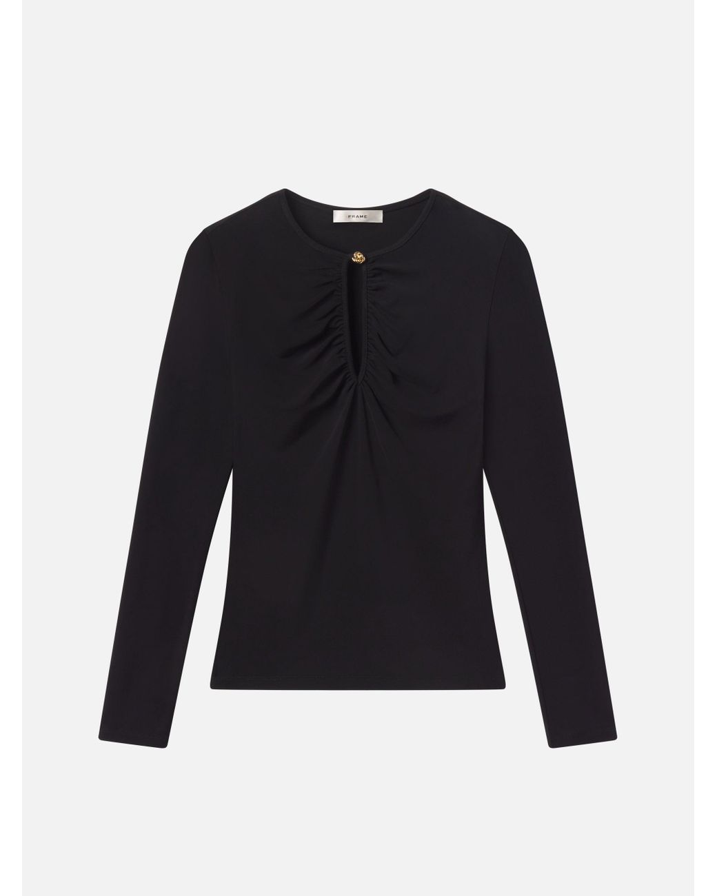 Sexy yet understated, this form-fitting top features a peek-a-boo keyhole with a gold knot button closure—the signature button featured throughout this collection. Crafted from jersey spandex. Colour: blue