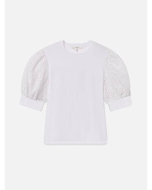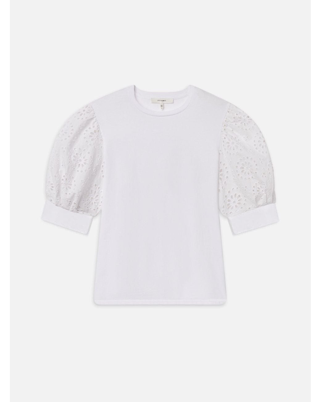 A fresh take on the classic tee. The Solstice Eyelet Tee features a clean crew neckline with airy eyelet sleeves that add subtle texture and dimension. Crafted from crisp cotton, it balances ease with a refined finish. Colour: white