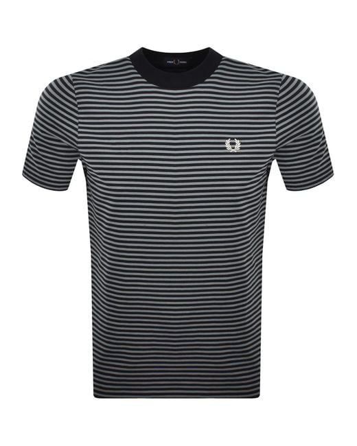Fred Perry Fine Stripe T Shirt In Navy And Light Smoke Blue. A heavyweight t shirt which features an all over fine stripe design with a ribbed crew neck and short sleeves. The signature Fred Perry Laurel Wreath logo embroidered on the left of the chest. 100% Cotton. Colour: blue