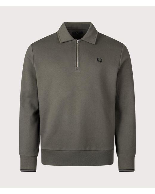 Effortless style, the Fred Perry Quarter Zip Collared Sweatshirt arrives this season in the Field Green colourway this season. Cut to a boxy and relaxed fit from a soft French terry fabric, with long sleeves, a turn down collar and a fine gauge quarter zip fastening, transition seamlessly from the office to the pub. Designed with ribbed trims and the signature 5-4-4 ratio twin tipping to the cuffs, finished with the iconic Fred Perry Laurel Wreath embroidered to the left of the chest. Relaxed fit, take your usual size for a looser fit 100% Cotton French terry fabric Turn down collar Quarter zip fastening Twin tipping at cuffs Embroidered Laurel Wreath to the chest Department: Clothing, Mens, Sweats & Hoodies, Fred Perry, Medium, 148 Field Green Colour: grey