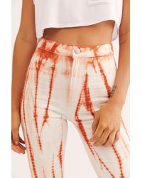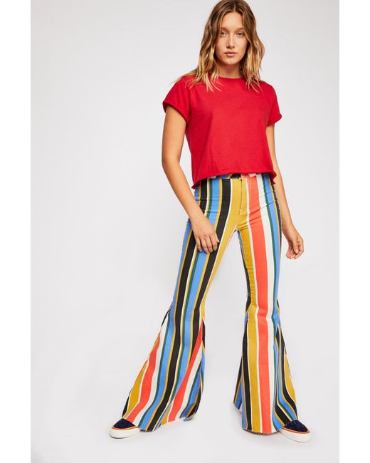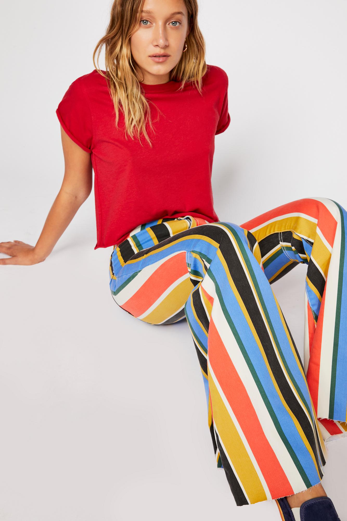 In a clean silhouette and geo print, the flat front, high-rise jeans feature a flared leg with a raw hem. Back seam detailing on the knee super soft and super stretch fabric back pockets button closure and zip flyplease note: content information differs: snake print and cheetah print: 92% cotton, 6% polyester, 2% spandex sunflower, tie dye, scarlet combo, malibu dreams stripe and baby blue combo: 53% cotton, 23% rayon, 22% polyester, 2% spandex. 22% Polyester,23% Rayon,2% Spandex,53% Cotton. Colour: multicolour