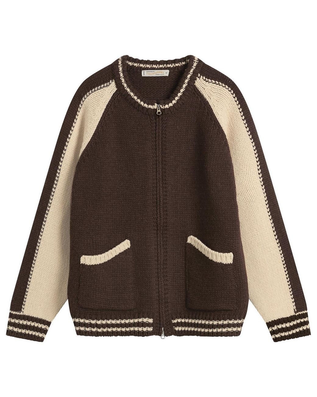 FrizmWORKS channels vintage athletic heritage through the Varsity cardigan, blending collegiate cues with refined craftsmanship. Knitted from premium wool, it delivers warmth and structure, while the zip‑front design modernizes the classic varsity silhouette. Ribbed trims and contrast detailing nod to traditional sportswear, reinterpreted with FrizmWORKS’ signature balance of utility and cultural nuance. Knitted Lambswool, Slightly Boxy Fit, Baseball Neckline, Cowichan Style Weave, Dual Zip Closure, 2 Front Pockets, Style Code: FZW2025FWKN001, Shop All Men's FrizmWORKS Cardigans, Shop All Men's Cardigans, - FrizmWORKS Men's Wool Varsity Zip Cardigan Brown Colour: brown