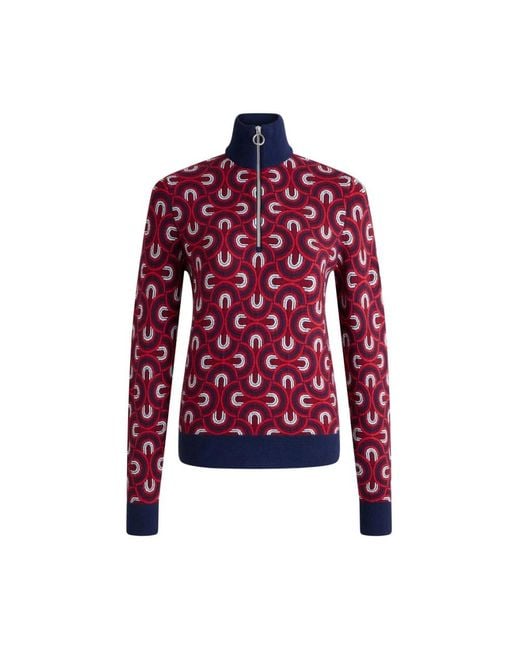 Fusalp Half-zip Turtleneck Jumper with a red and blue jacquard pattern and a practical half-zip high neck. A versatile knit ideal for layering on cool days. Key attributes: Multicolour | Red | Blue | Half-zip fastening | High neck | Jacquard pattern | Long sleeves | Ribbed hem Colour: red