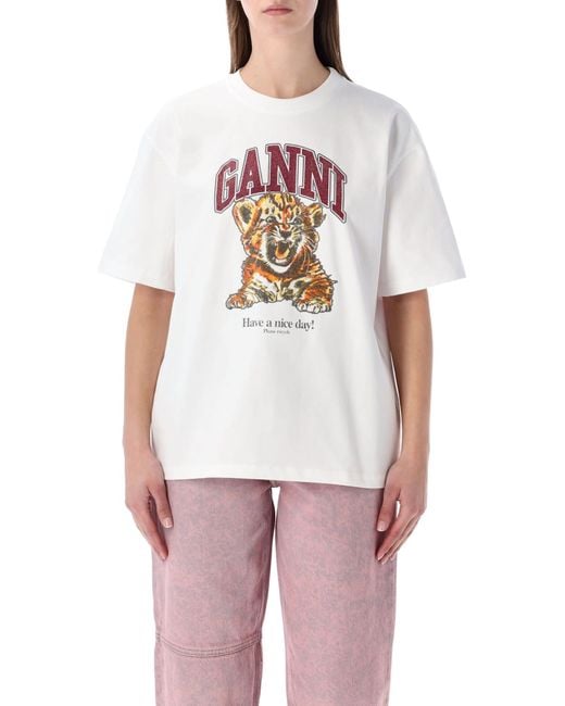 A Fresh Interpretation Of A Wardrobe Staple, The Ganni Beaded Tiger T-shirt Combines Playful Graphics With Refined Detailing. Crafted From Organic Cotton, It Features A Classic Round Ribbed Neckline And Short Sleeves. The Beaded Tiger Print Adds Texture And Visual Depth, While The Ganni Logo And The Signature have A Nice Day! Please Recycle Message Underline The Brand s Distinctive, Responsible Attitude. Round Ribbed Neckline Short Sleeves Beaded Tiger Print Graphic Ganni Logo have A Nice Day! Please Recycle Message Alessandra Is 1,75 M And Wears Size SComposition: 100% organic cotton Colour: white
