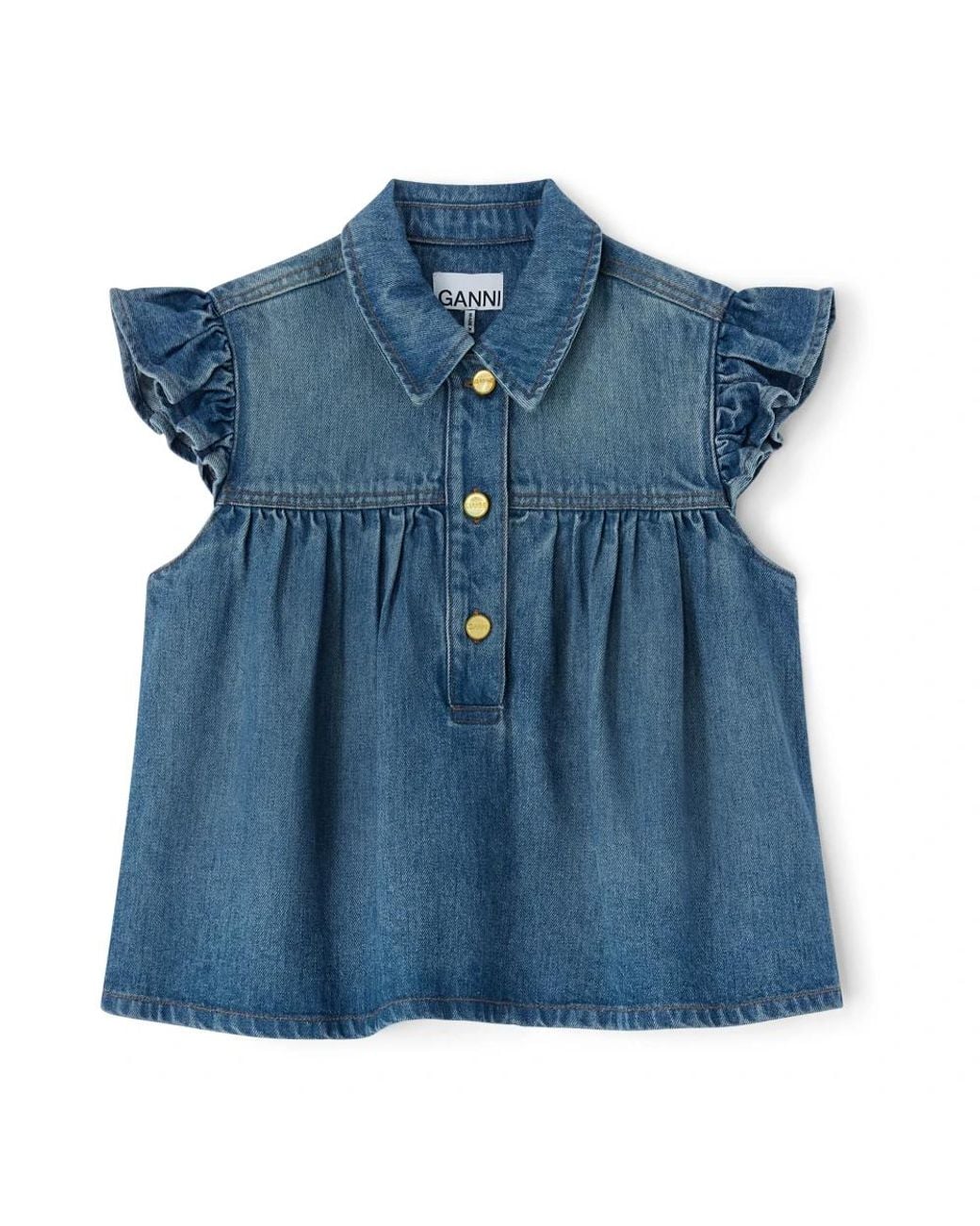 Ganni Denim Light Weight Top is a lightweight cotton denim top featuring ruffle trim and button fastening. It’s designed for easy layering and casual, everyday wear. Key attributes: Blue | Mørk Blå Melert | Cotton | Lightweight fabric | Button fastening | Ruffle trim | Denim styling | Composition & care: 100% cotton | Machine wash gentle 30°C. Colour: blue