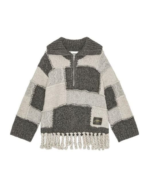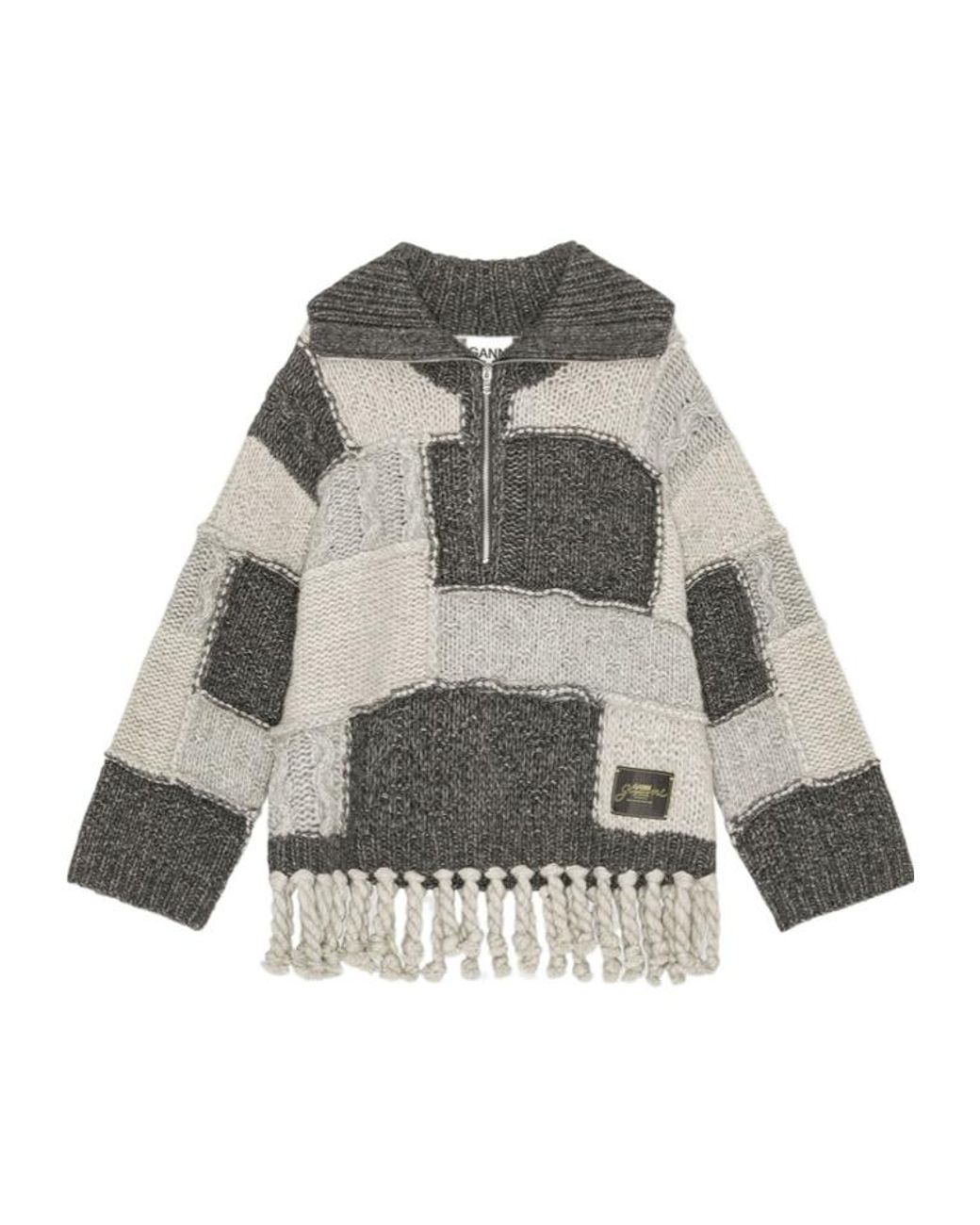 This jumper features a patchwork design with a zip closure at the front. The jumper has a fringe hem and a GANNI logo patch at the front. * 55% wool, 45% organic cotton Learn more about our materials * Patchwork design * Knit collar * Zip closure * GANNI logo patch * Fringe hem detail Made in: China Product ID: K2508 * Oversized fit * Bernie is 180 cm and wears a size IT S/M For personalised guidance on sizing and fit, contact our Customer Service team here. Colour: grey
