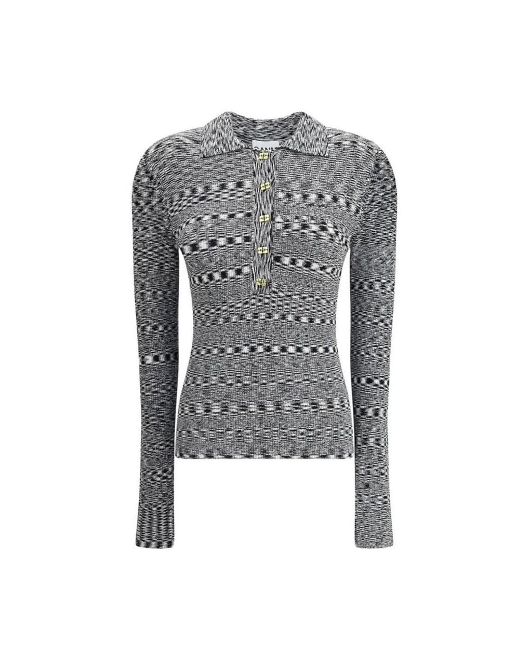 Ganni Space-Dye Knit Polo Shirt updates the classic polo silhouette with a distinctive space-dye finish. It’s a versatile knit that transitions easily from everyday wear to smarter occasions, pairing well with jeans or skirts. Key attributes: Black | Space-dye pattern | Polo collar | Button placket | Updated modern details