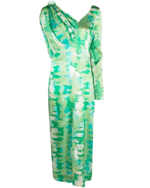 Women's Green Printed Off-Shoulder Silk Dress