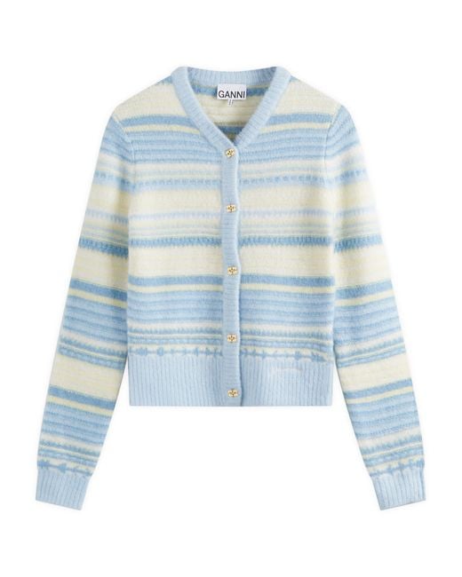 It's all about layers with the GANNI Stripe Cardigan, featuring an all over tonal design, it's decorated with the latest GANNI butterfly logo as buttons. Pair over an oversized collar and with a spot of leopard print for an iconic GANNI girl look. 32% Alpaca Wool, 32% Merino Wool, 30% Polyamide, 6% Elastane, Branded Button Fastening, Embroidered Branding, GANNI, - GANNI Women's Stripe Cardigan Skyway