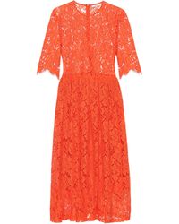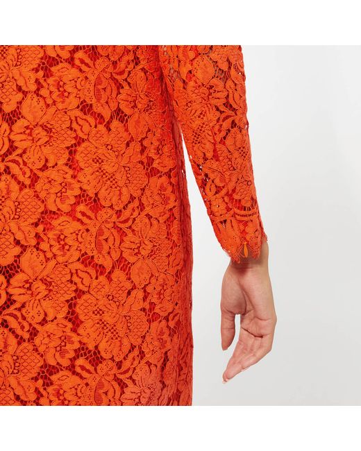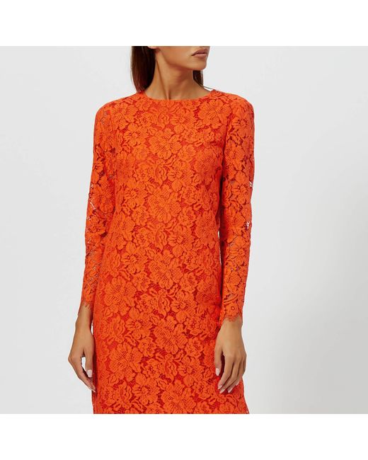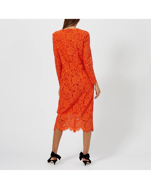 Women's 'Jerome' midi dress from Danish fashion house, Ganni. Crafted with luxurious cotton blend lace, the red dress features a round neckline, long sleeves and a scalloped hem. Fastening with a concealed zip to the nape, the design is finished with further zips at the cuffs and hem for customisable coverage. 45% Polyamide, 37% Cotton, 18% Viscose Model is 174cm/5'8.5 and wears a size DK 36/UK 8. Colour: red