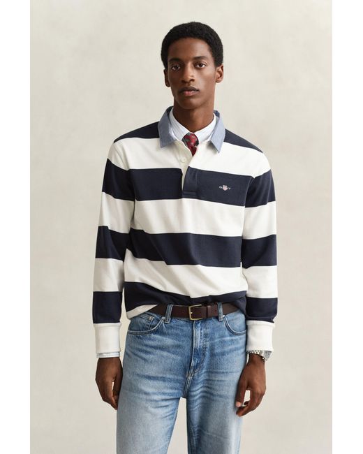 Featuring a small-scale shield graphic embroidered at the chest, this striped rugger is crafted from 100% cotton and designed with a regular fit. Timeless, classic and versatile, the design is complete with a chambray collar and a classic three-button placket.