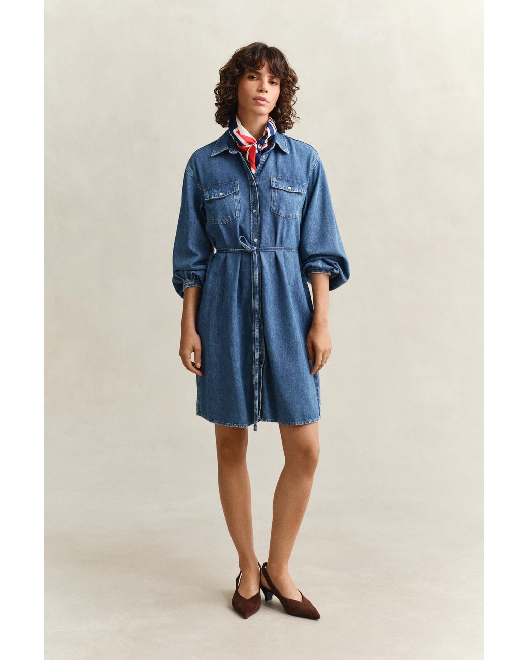 Crafted from a cotton blend, this denim dress is an essential for the season. Cut for a relaxed fit, it follows a shirt silhouette but elevated with volume sleeves and dropped shoulders. Designed with a point collar and recycled polyester buttons, the dress features snap button closure, chest pockets, hidden side seam pockets and a length that finishes right above the knees. This garment is intended for a relaxed fit. For a closer fit, we recommend sizing down. Colour: blue