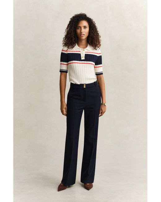 Crafted from a recycled polyester blend, these flared trousers bring a nautical touch to your wardrobe. Cut for a slim fit and designed with a mid-rise waist, the trousers feature a front fly opening with double button closure, pressed crease detailing, slanted front pockets, back welt pockets and branded gold-toned buttons. Colour: blue