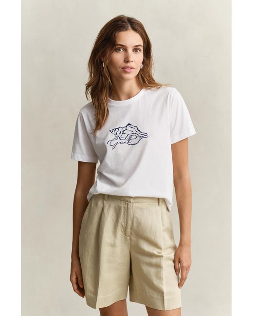 This T-shirt is crafted from 100% cotton and cut for a regular fit. It features short sleeves and a ribbed crew neck. Each colorway features a different and unique seasonal Gant graphic printed at the chest. Colour: natural