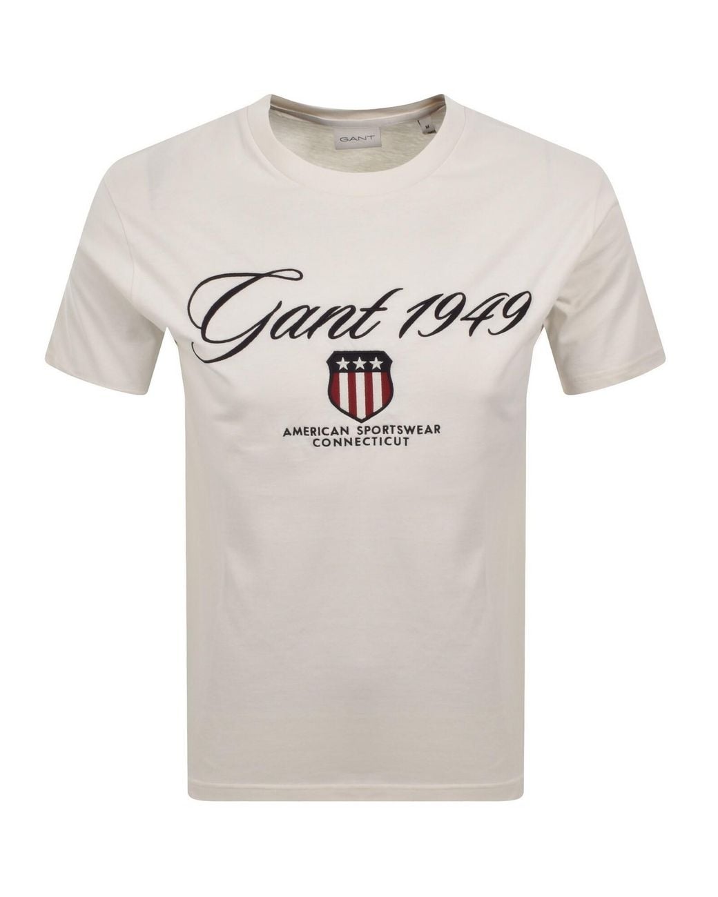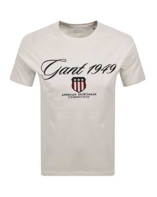 Gant Graphic T Shirt In Cream. A ribbed crew neckline and short sleeves. The Gant logo shield and text are embroidered on the chest. 100% Cotton. Colour: grey