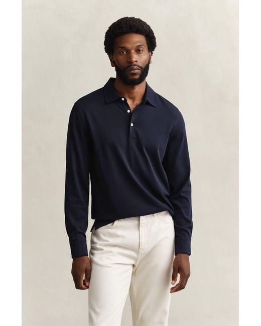 This long-sleeved polo shirt is made from Pima cotton – a soft and durable fibre. It is made for a regular fit and features details from our shirting designs such as the collar and buttoned cuffs. Other details include a buttoned placket, side hem slits and a small label woven at the hem. Colour: blue