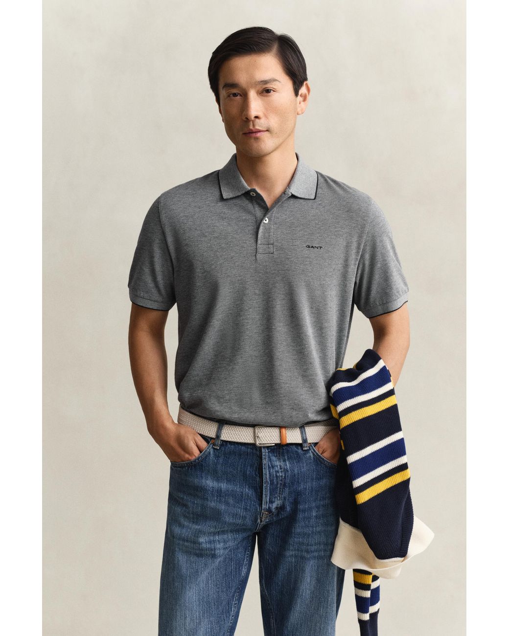This polo shirt is made in a regular fit from 100% cotton in a two-tone piqué texture. Accented with yarn-dyed stripes at the collar, this polo shirt features a flat knit collar with a two-button placket, side hem slits, and embroidery at the chest. Colour: grey