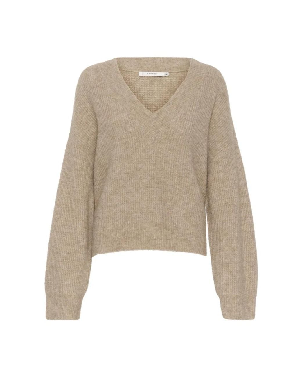 Stay cosy and stylish in this incredibly soft and luxurious knitwear from Gestuz. Featuring long sleeves, a V-neck, and a relaxed silhouette, this Alphagz V-Neck Noos Knit in Warm Sand Melange is a must-have for the modern woman. Loose fit. Material: 32% alpaca, 32% wool, 30% polyester, 6% elastane. Colour: natural