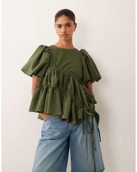 Tops by Ghospell Round neck Puffed sleeves Ruched details Button-keyhole back Regular fit. Colour: blue
