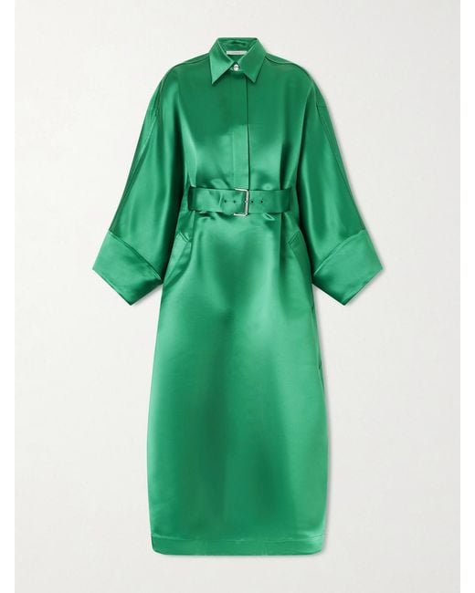 Women's Green Belted Silk-Satin Shirt Dress