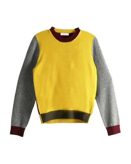 Yellow grey sleeves maroon ribbed cuffs olive green hem wool crew neck Size: M. Gender: Male. Material:Wool. Colour: yellow