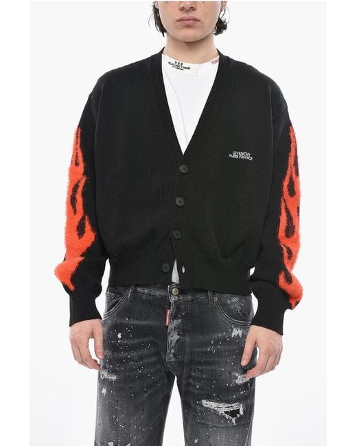 Men's Black Cotton-Blend Cardigan Flames With Jacquard Sleeves