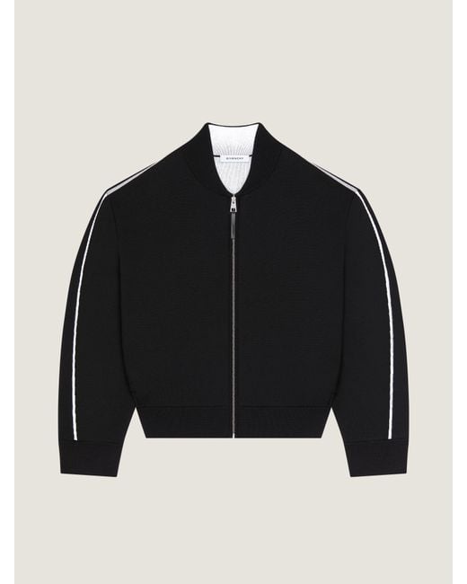 Echoing Givenchy’s couture heritage, the curved, inverted seam traces sleeves and trouser legs to create a sculptural silhouette. The Givenchy Paris logotype draws on vintage university references, reinterpreting classic lettering in subtle, contrasting and embroidered applications.- Long-sleeved cardigan in wool. - Bomber collar. - Contrasting GIVENCHY Paris jacquard on the back. - Zipped closure. - Elasticated knitted collar, hem and cuffs. - Couture seams for a rounded proportion. Colour: black