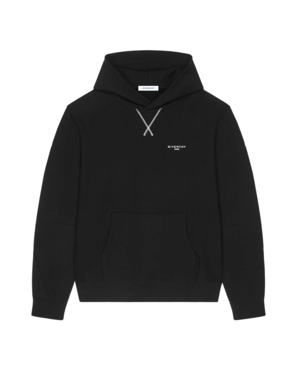 Givenchy Couture Seam Hoodie blends everyday comfort with couture-inspired shaping. The fleece hoodie features a subtle 'Givenchy Paris' chest embroidery and curved seams for a rounded, refined silhouette. Key attributes: Black | Cotton | Drawstring hood | Kangaroo pocket | Ribbed hem and cuffs | Small Givenchy Paris signature embroidered on the chest | Contrasting stitching details on the front | Couture seams for a rounded proportion | Dimensions & fit: Relaxed fit | Model measures 6.1 ft and wears size M | Composition & care: 100% cotton | Machine wash max 30°C delicate cycle. Iron at max soleplate 110°C without steam. Do not tumble dry. Do not bleach. Do not dry clean. Colour: black