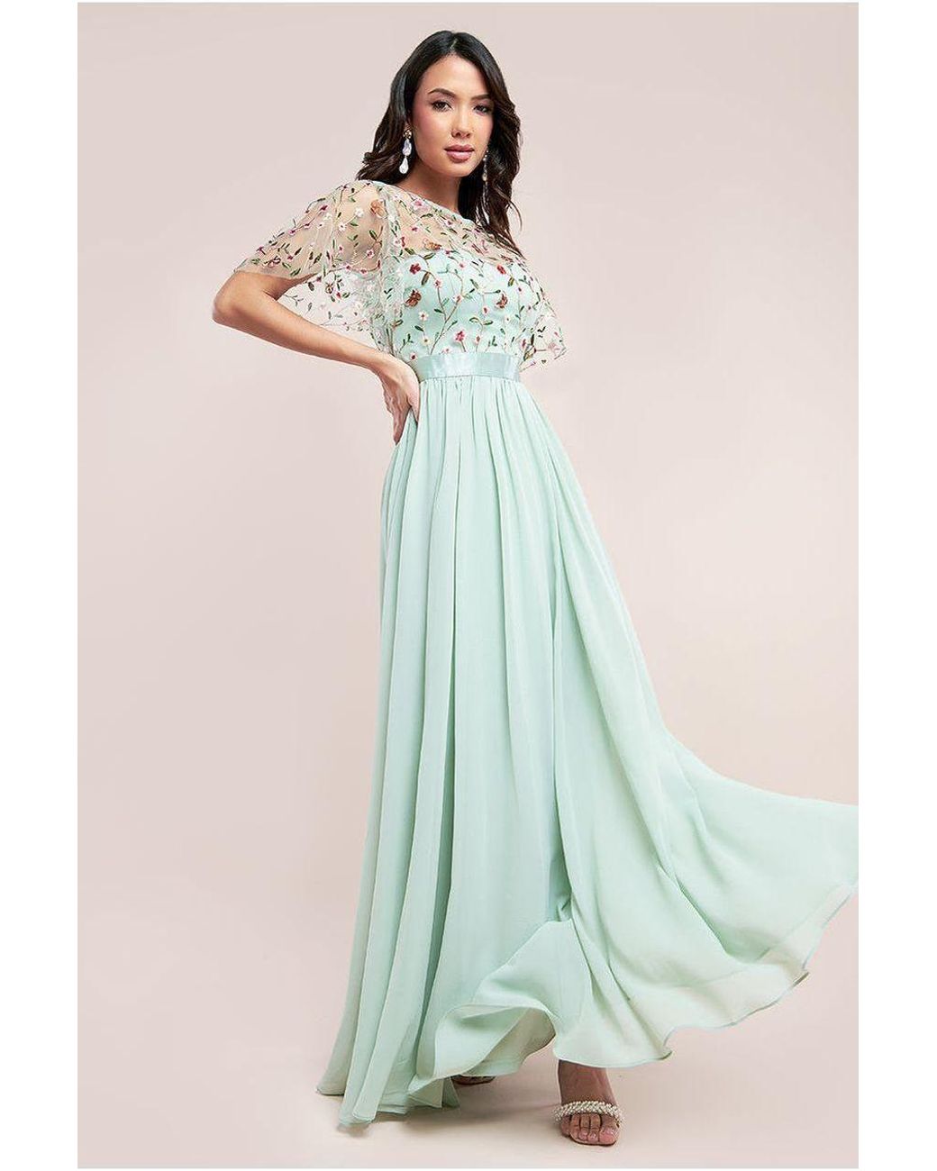Women's Green Embroidered Top Flutter Sleeve Maxi